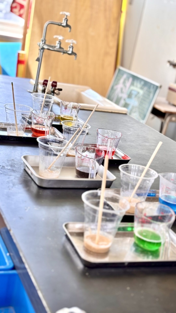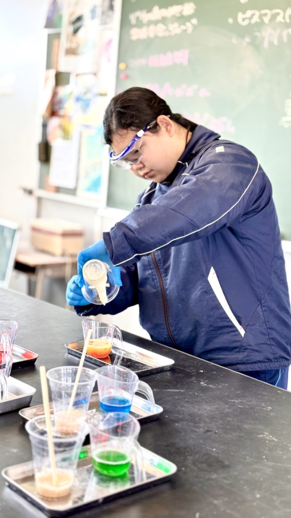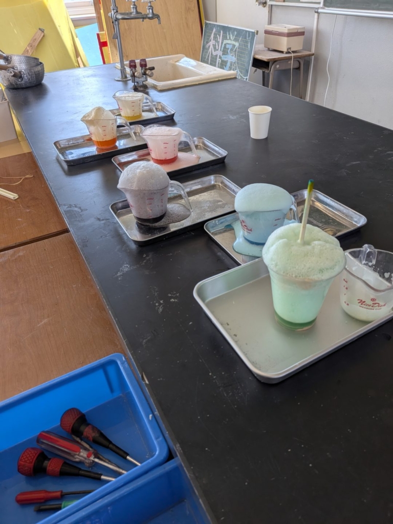 オキシドールの反応を見る実験を行いました。どんな配合で混ぜると,一番よく反応するか,対照実験を何度も行いました。