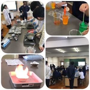 スーパーボールがPVAの塩析を利用しているということを説明したり,炎色反応が日常生活のどこに使われているかを説明したり,2つの試薬を混ぜて炎色反応を起こすとどうなるか観察したりしました。