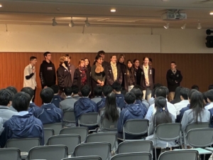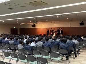 3年生各クラスが校内合唱コンクールの曲を披露すると,お返しに訪日生徒から国歌とポップな曲が贈られました。