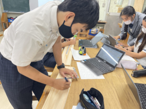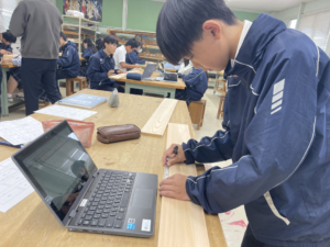 クロムブックでCADを用いて設計図を描き、設計図をもとに木材を加工する授業を行いました。