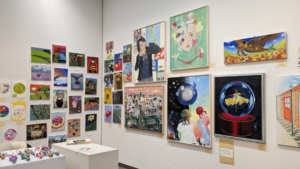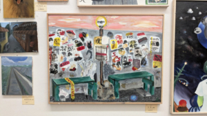 ※今年度の全国公募展「第75回学展」高校生の部で入賞作品に選ばれた4年生の山本彩乃さんの「忘却」も展示しています。(※「忘却」は画像の中のバス停の情景を描いた作品です)