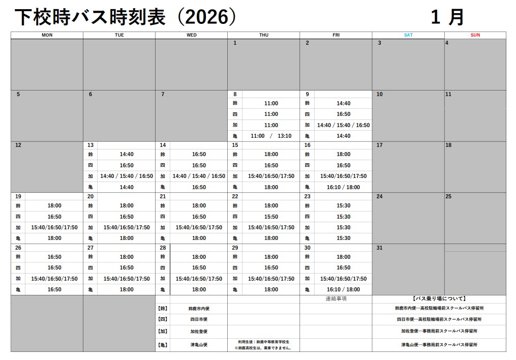 スクールバス 1月運行予定表(下校時) | 鈴鹿享栄学園 鈴鹿高等学校