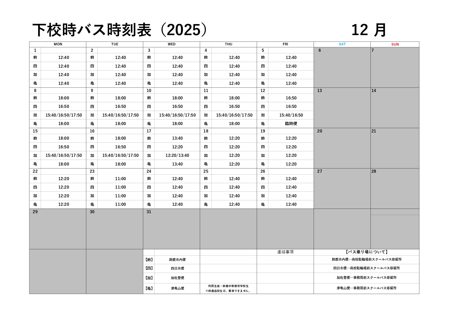 スクールバス 12月運行予定表(下校時) | 鈴鹿享栄学園 鈴鹿高等学校