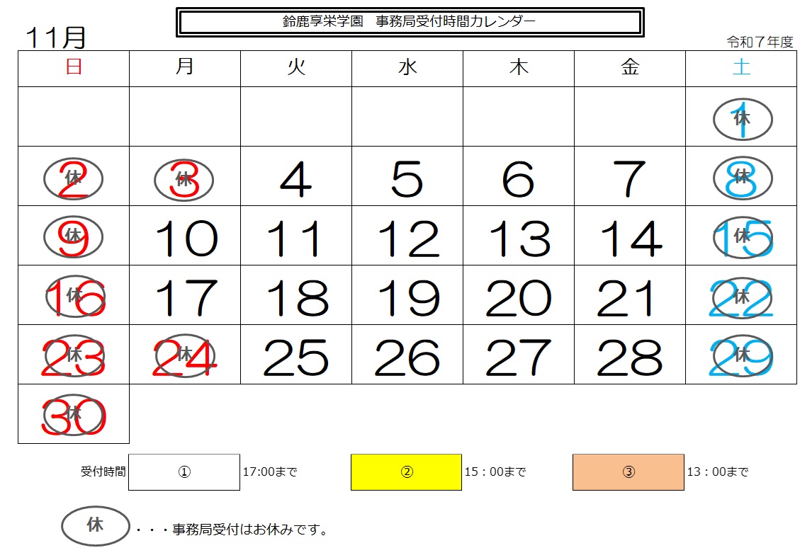 2025年11月の事務局の対応時間及び電話受付時間をご案内します。 ご不明な点は学校までお問い合わせください。 (TEL059-378-0307)