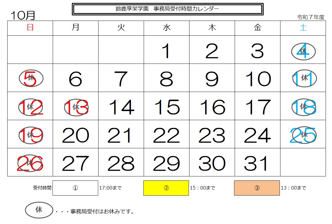 2025年10月の事務局の対応時間及び電話受付時間をご案内します。 ご不明な点は学校までお問い合わせください。 (TEL059-378-0307)