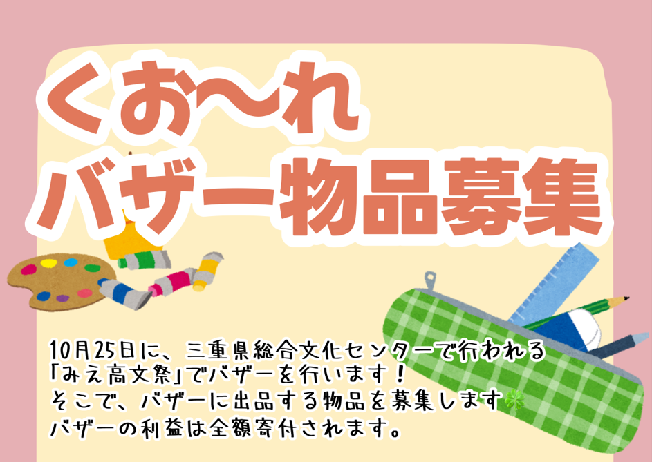 10月25日(土)三重県総合文化センターにおいて、みえ高文祭が開催され、ボランティア部門はフリーマーケットを行います。 それに向け、現在くお~れは販売する物品を放課後の時間を使って集めていますが、まだ物品が少ない状況です。 是非、お家に寄付...