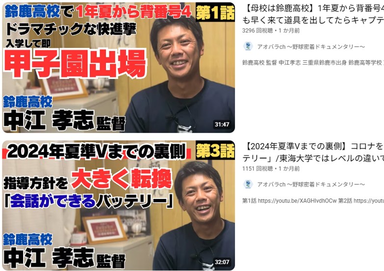 硬式野球部監督の中江先生がYoutubeで紹介されました。 第1話、第2話、第3話 左記のリンクよりご視聴ください。