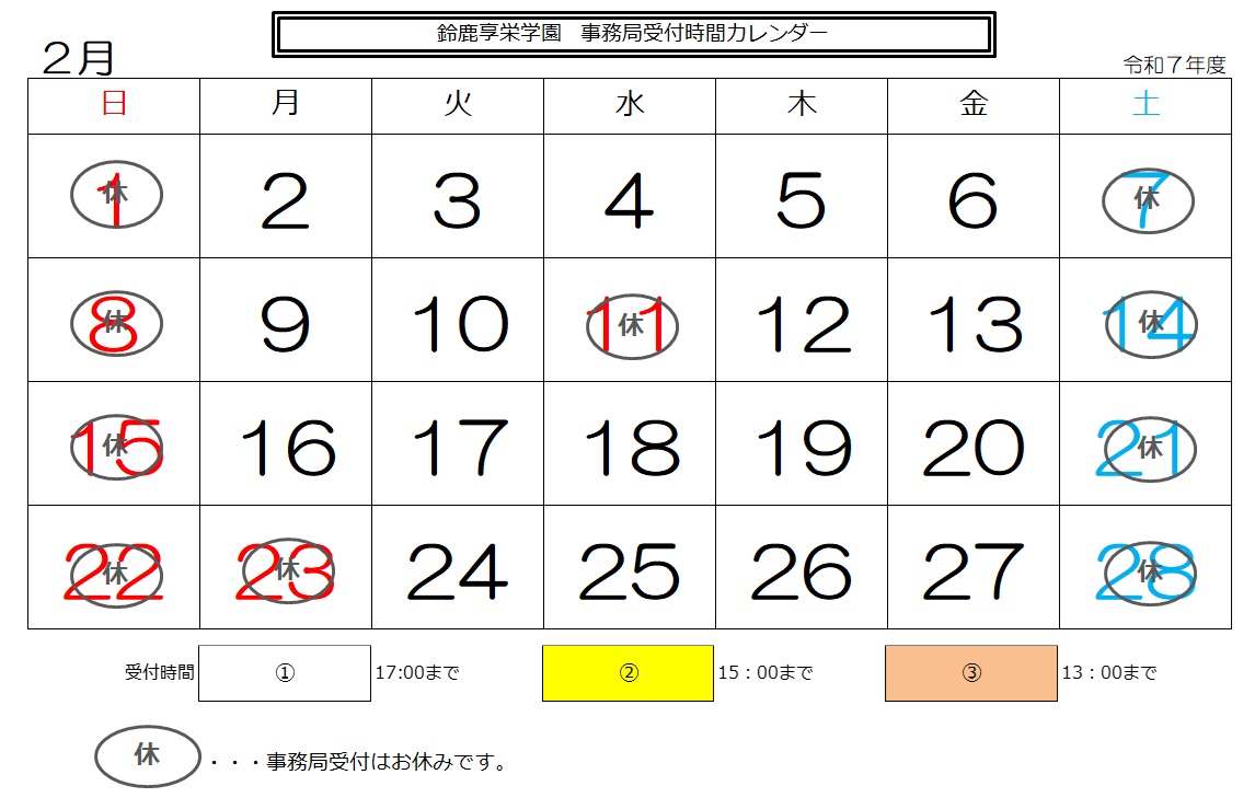 2026年2月の事務局の対応時間及び電話受付時間をご案内します。 ご不明な点は学校までお問い合わせください。 (TEL059-378-0307)